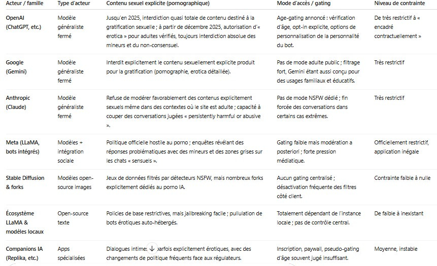 Grands modèles généralistes fermés (OpenAI, Google Gemini, Anthropic Claude, etc.) : traditionnellement très restrictifs sur le pornographique, au nom de la « safety », avec des politiques qui assimilent quasi systématiquement NSFW et contenu à proscrire.